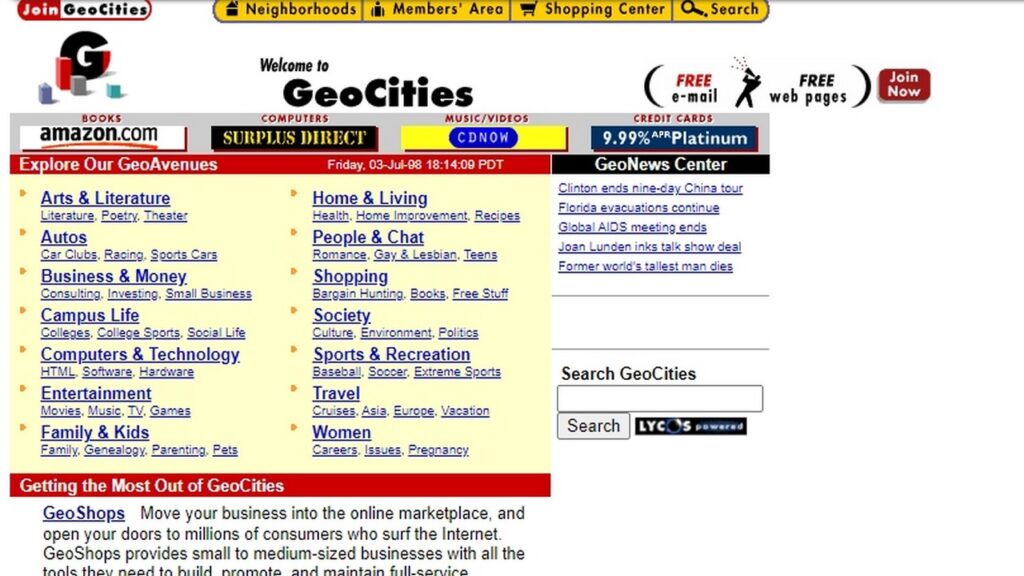 Geocities (1994-2009): Plataforma de creación de sitios web con páginas simples, donde los usuarios subían contenido estático, sin funcionalidades de interacción más allá de la navegación.